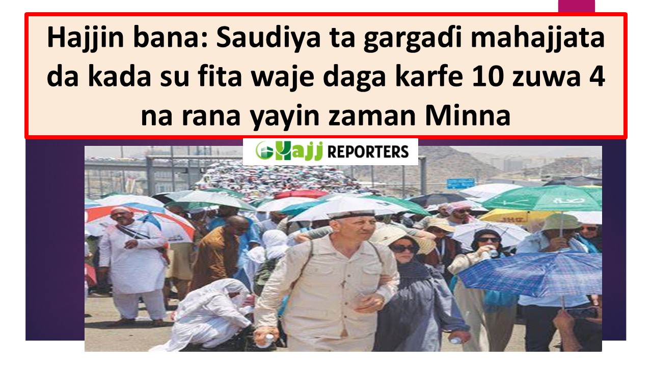 Ma’aikatar Hajji da Ummara ta ƙasar Saudiyya ta baiwa alhazan da za su yi aikin Hajjin bana da kada su fita waje daga ƙarfe 10 na safe zuwa 4 na yamma a yayin zaman Masha’ir, wato kwanaki huɗu da mahajjata ke yi q garin Minna don gudanar da ibadar Hajji.